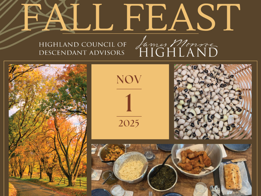 Join us on Saturday, November 1, for Fall Feast, a celebration of African American food, farming, history, and health. Discussions and health information starting at 11:00 a.m., followed by a traditional Thanksgiving meal at 2:00 p.m. This event is hosted by Highland’s Council of Descendant Advisors.